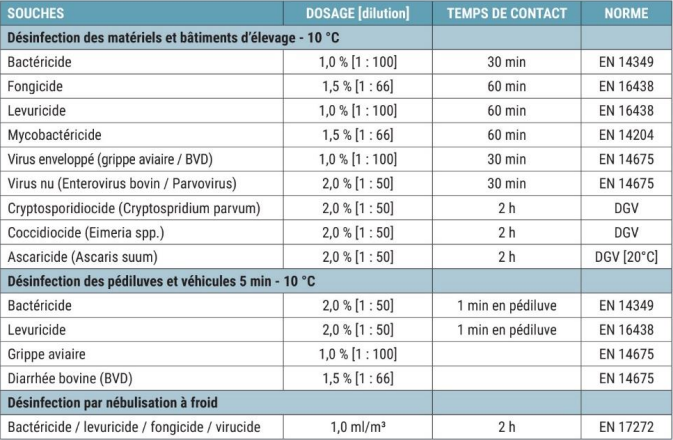 Dosage : 1 à 2 % dans l'eau selon les micro-organismes visés.