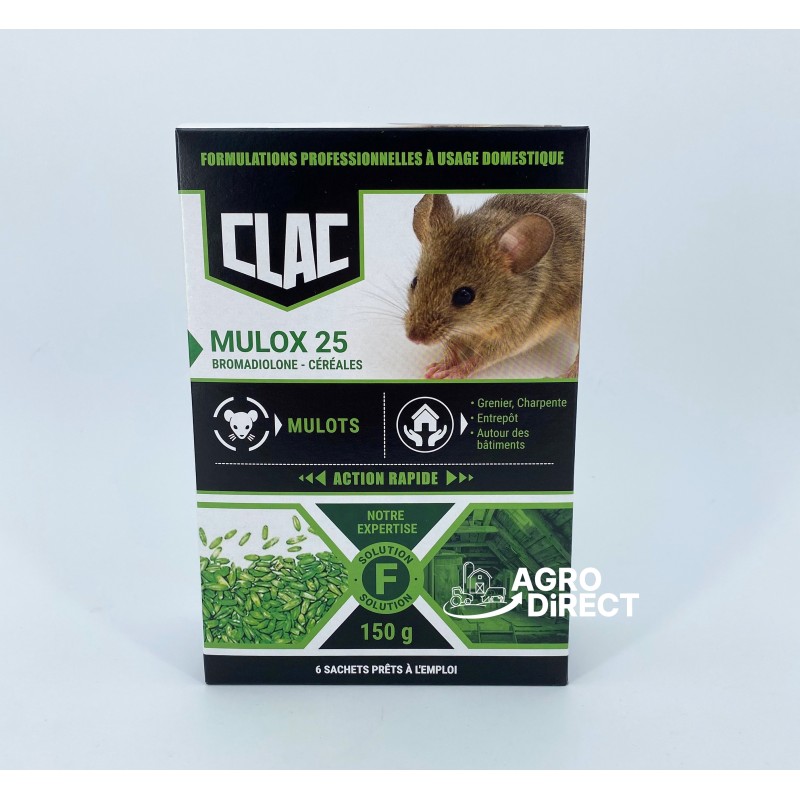 Le produit Mulox 25, est un produit en grains, contre les mulots. Mulox 25 est composé de 6 sachets d’avoine décortiquée, très appétant. La matière active utilisée est le bromadiolone 0,0025%.