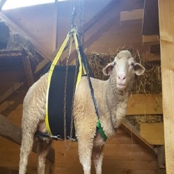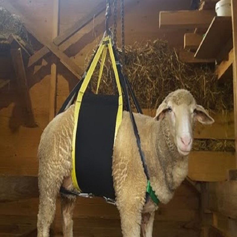 Harnais de levage conçu pour maintenir les moutons en toute sécurité lors des soins, pesées ou parages, alliant ergonomie, confort et facilité d’utilisation.