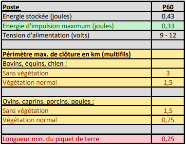Le poste à pile P60, est un électrificateur qui convient pour les clôtures mobiles et fonctionne avec une pile 9 Volt ou sur batterie 12 Volt. Il possède un commutateur rotatif avec 2 niveaux de puissance, une impulsion lente, un mode éco. nuit ainsi qu'un contrôle de clôture et de pile.