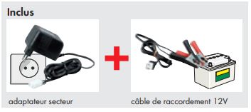 Vendu avec un adaptateur secteur ainsi qu'un câble de raccordement 12 Volts.